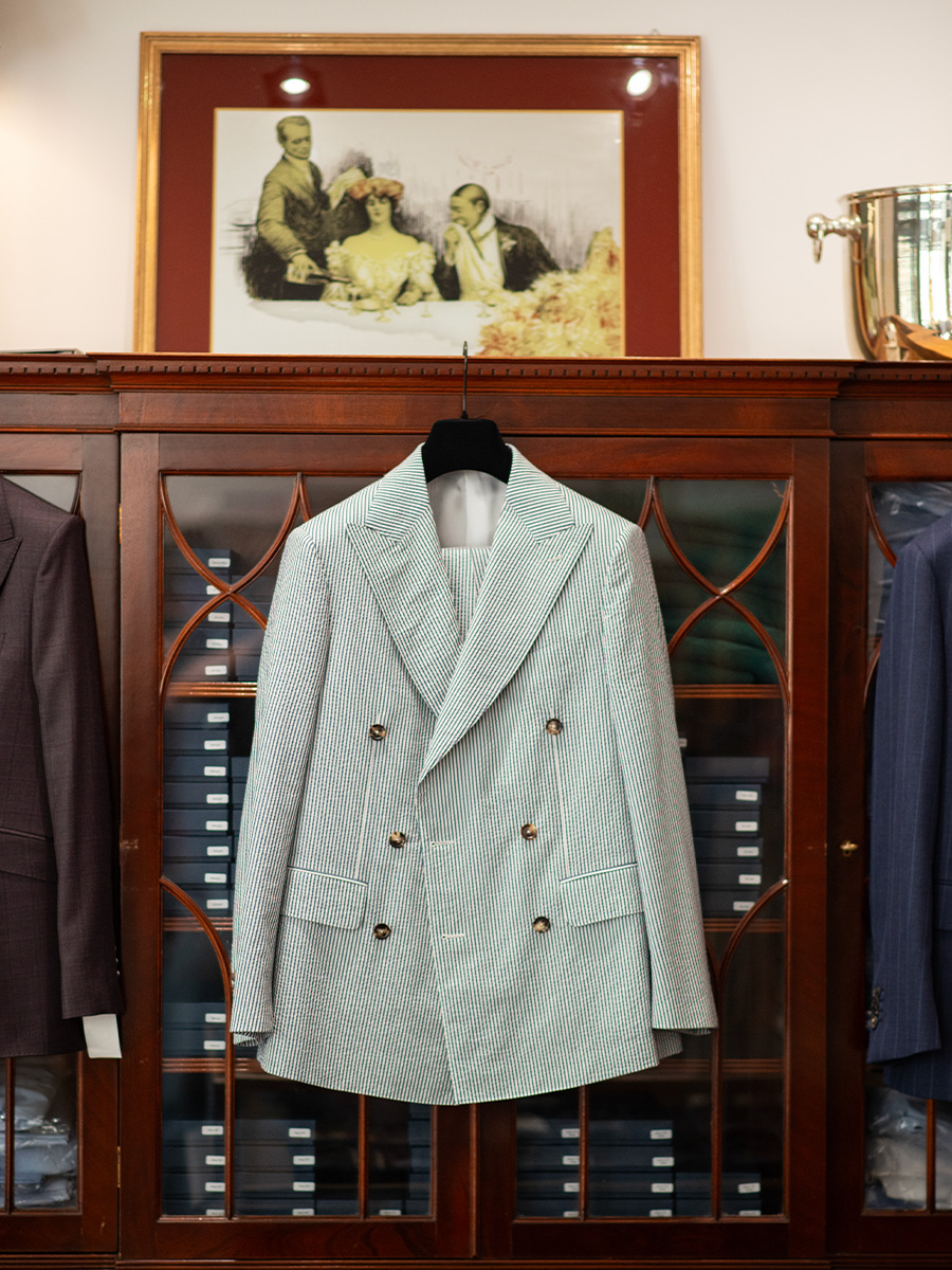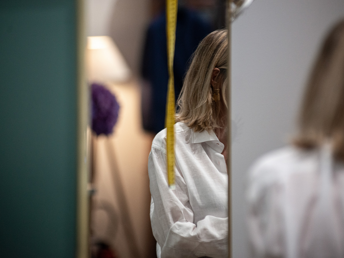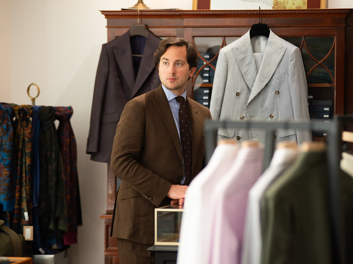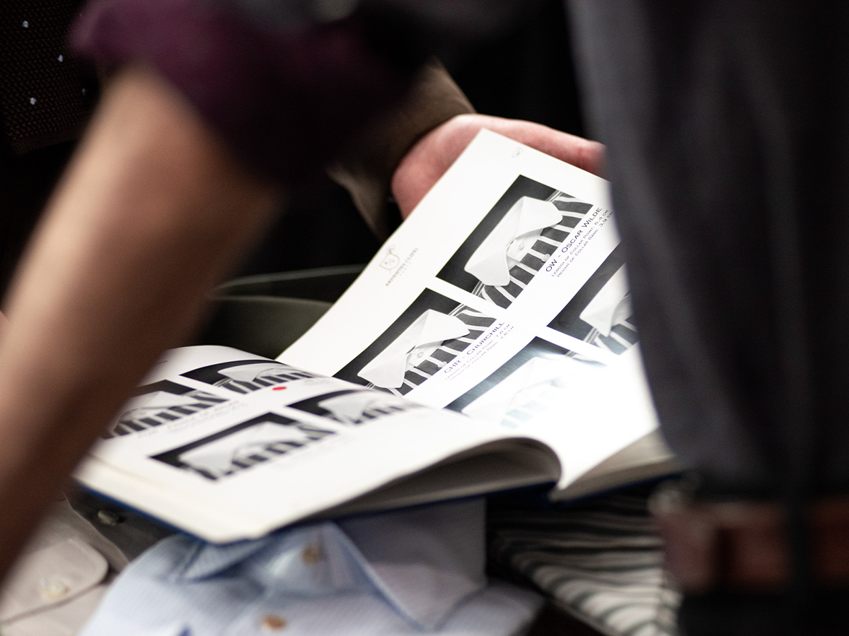 Guidare i clienti tra oltre duemila referenze di tessuti richiede istinto, ascolto e sensibilità. Per Biette tutto parte dalla materia. «È il tessuto che indossi più vicino alla pelle», dice. «Devi davvero apprezzarne la sensazione e deve adattarsi al tuo stile di vita.» I clienti possono esplorare centinaia di forme di colletti, polsi, costruzioni del dorso e dettagli stilistici, dai più classici ai più audaci. È un processo tattile e riflessivo, costruito sul dialogo piuttosto che sulla prescrizione.